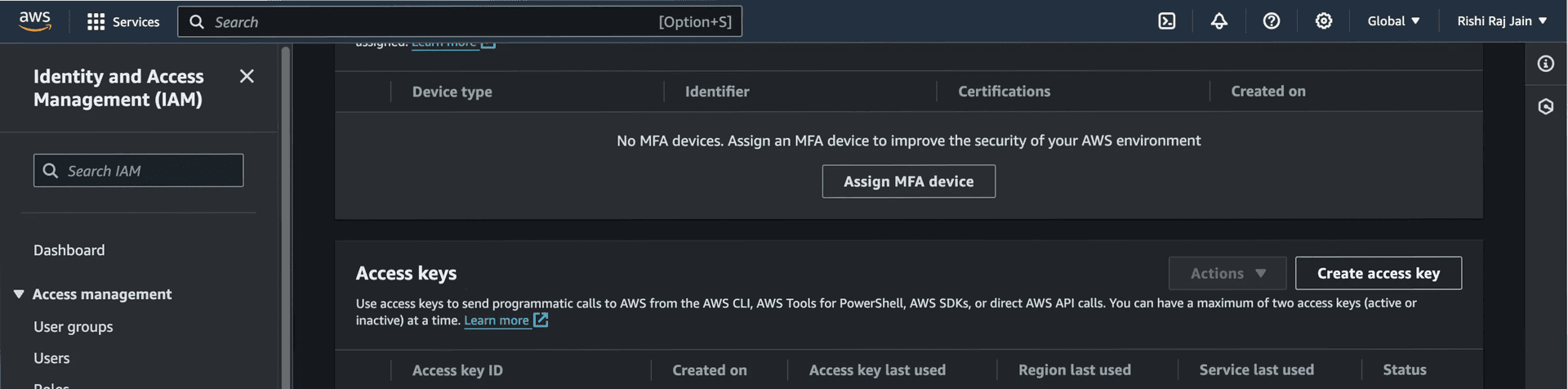 In the navigation bar on the upper right in your AWS account, click on your name, and then choose Security credentials.