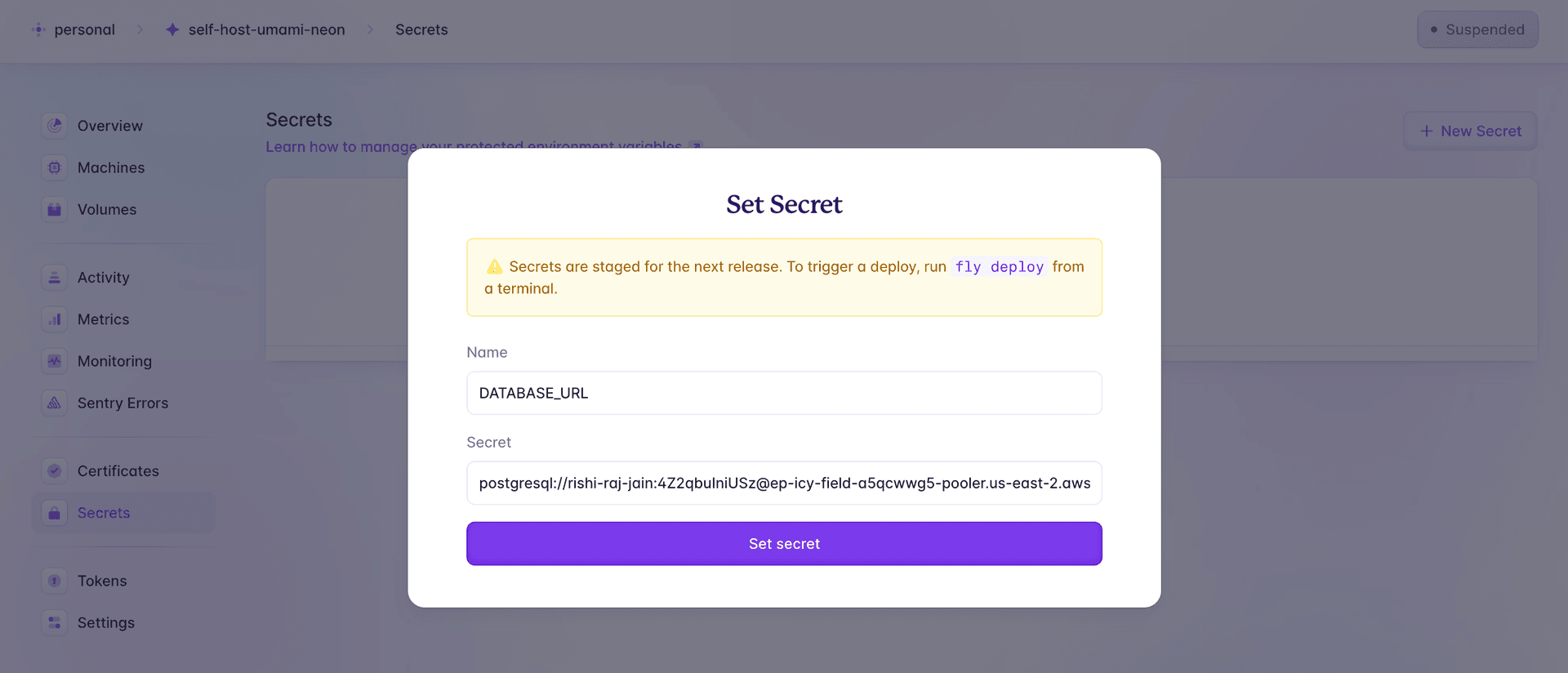In the modal, set the name of the secret as DATABASE_URL, and set the Secret value to be the one that we obtained in the previous section. Click Set secret to save the environment variable.