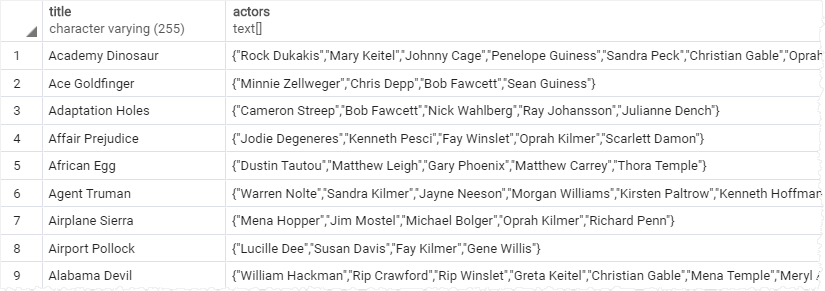 As you can see, the actors in each film are arbitrarily ordered. To sort the actors by last name or first name, you can use the ORDER BY clause in the ARRAY_AGG() function.